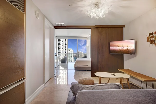 Wander Brickell River is a sleek two-bedroom waterfront suite set inside the iconic W Hotel at Icon Brickell, offering front-row views of the Miami River and Biscayne Bay.