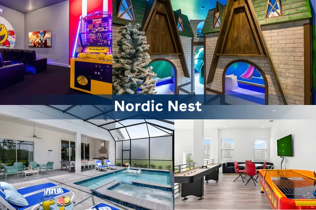 Solterra Resort is a luxurious gated vacation community near Disney World featuring a resort-style pool with waterslide, lazy river, hot tub, clubhouse, fitness center, and sports courts—perfect for families seeking an all-inclusive retreat with endless entertainment and relaxation options.
