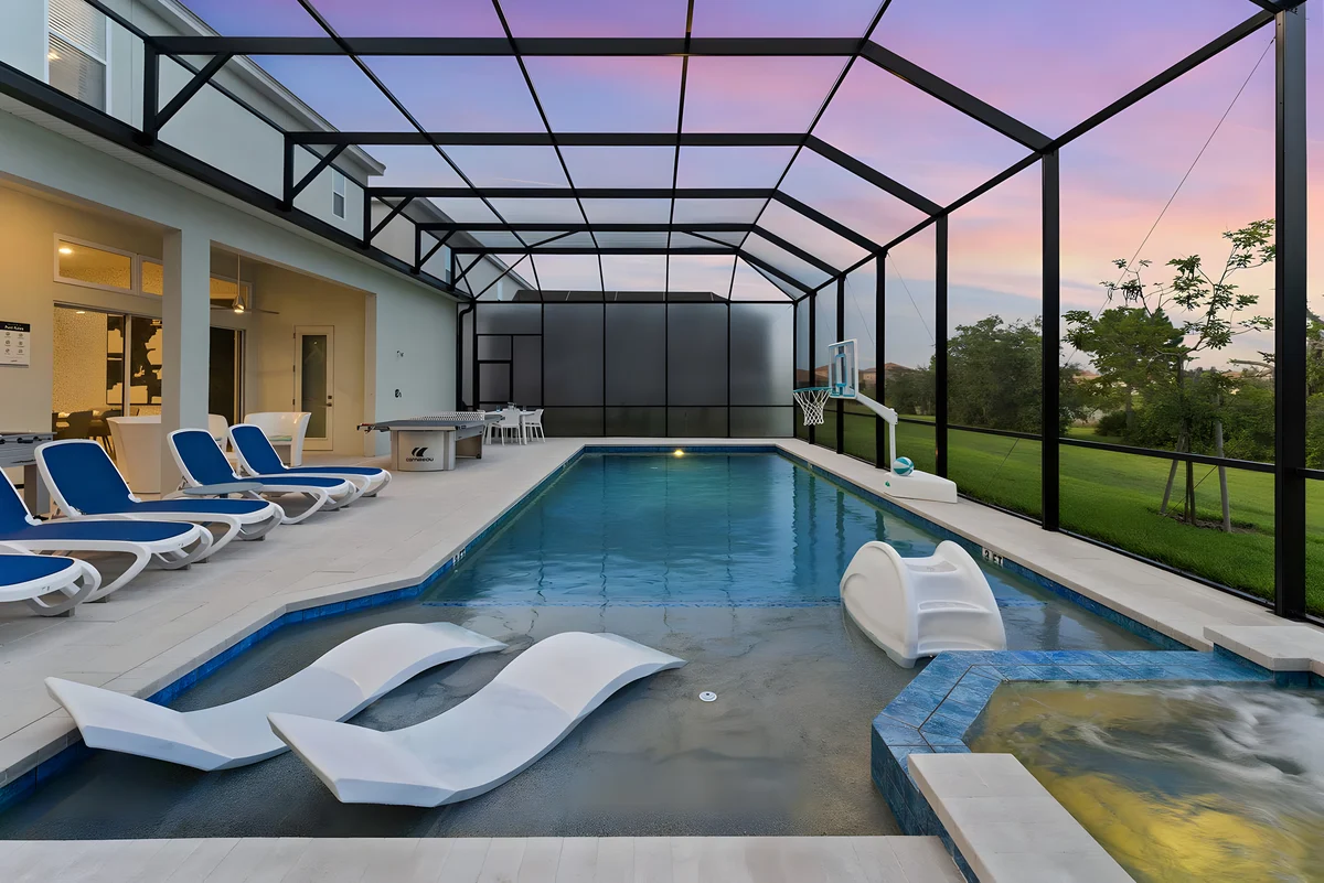Unwind at Solterra Resort's expansive pool complex, featuring a zero-entry pool, thrilling waterslide, lazy river, and jacuzzi amid lush surroundings just minutes from Disney. Families and thrill-seekers love this all-day playground of water fun, sports courts, and clubhouse vibes.