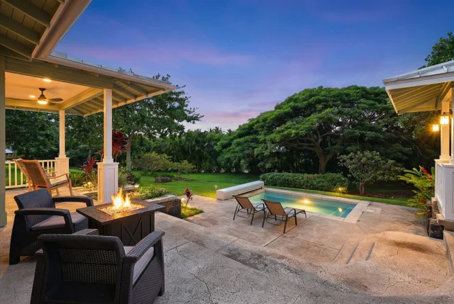 Located in the upscale Kukui‘ula community on Kauaʻi’s south shore, this address sits within a lush, tropical enclave of manicured landscapes, golf course fairways, and the pull of ocean breezes. The area features private walking paths, gardens, and ocean glimpses nestled among vibrant foliage.