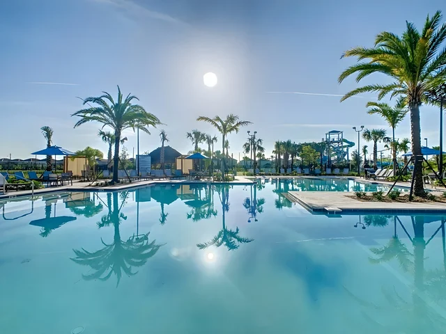 Dive into Reunion Resort's private five-acre water park, where a thrilling water slide, 1,000-foot lazy river, and splashing playground with a tipping bucket create endless family fun under the Florida sun. Perfect for kids and parents seeking shaded cabanas, lawn games, and poolside treats.[1][2]