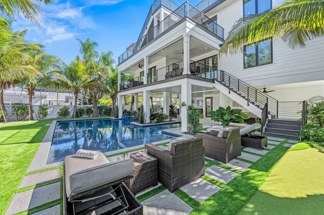 Escape to Wander Lido Key Breeze, a luxurious multi-level retreat featuring a private pool and spa with ample outdoor seating, perfect for relaxing under the sun.