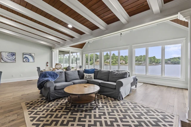 Wander Mooresville Lakefront is a luxury lakefront retreat showcasing contemporary interiors, designer furnishings, and upscale amenities including a hot tub, cold plunge, chef-ready kitchen, and a private dock and watersports gear for effortless lake days.
