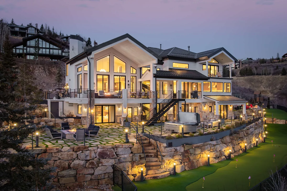Wander Park City Aerie is a private mountain estate set on nearly two acres above Old Town, featuring panoramic mountain views, a chef’s kitchen with Wolf appliances, private hot tub, glass-enclosed pickleball and basketball court, outdoor pizza oven, fire pits, fitness room, arcade and media lounge, putting green, and expansive decks for outdoor dining and entertaining.