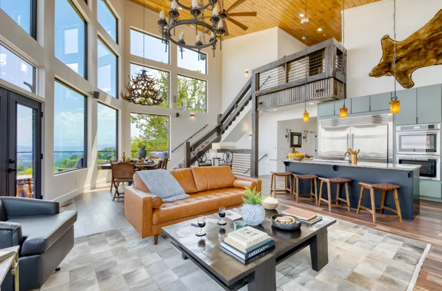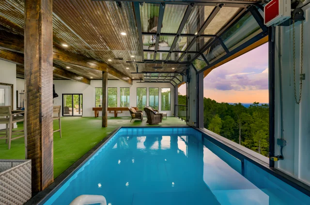 Wander Pigeon Forge Mountainview is a striking luxury retreat perched high above the Smokies, featuring soaring ceilings, floor-to-ceiling windows, a private indoor pool, a hot tub, a game room with an arcade game, and an expansive deck with panoramic mountain views and fire features—perfect for unforgettable group escapes.