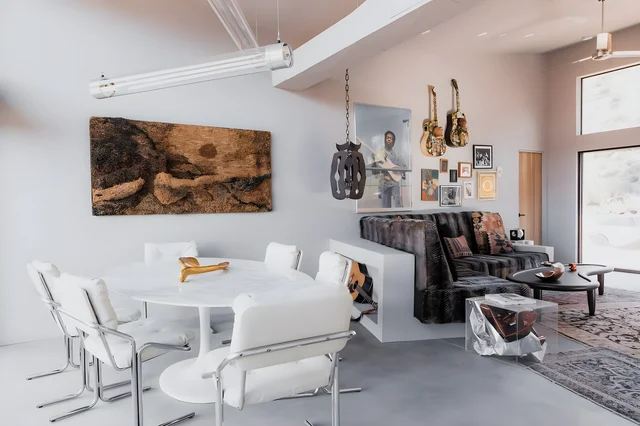 Mojave Gold is a stylish desert destination in Yucca Valley featuring New-California cuisine with locally sourced ingredients, live music performances, and a striking black-and-gilt disco aesthetic inspired by Studio 54 meets retro rock'n'roll fantasy.