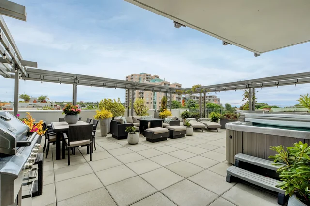 Wander Victoria Downtown is a rare and luxurious condo offering a secluded oasis with an expansive private terrace featuring a hot tub, sun loungers, outdoor dining, BBQ, and a fire pit, all while boasting spectacular Olympic mountain views.